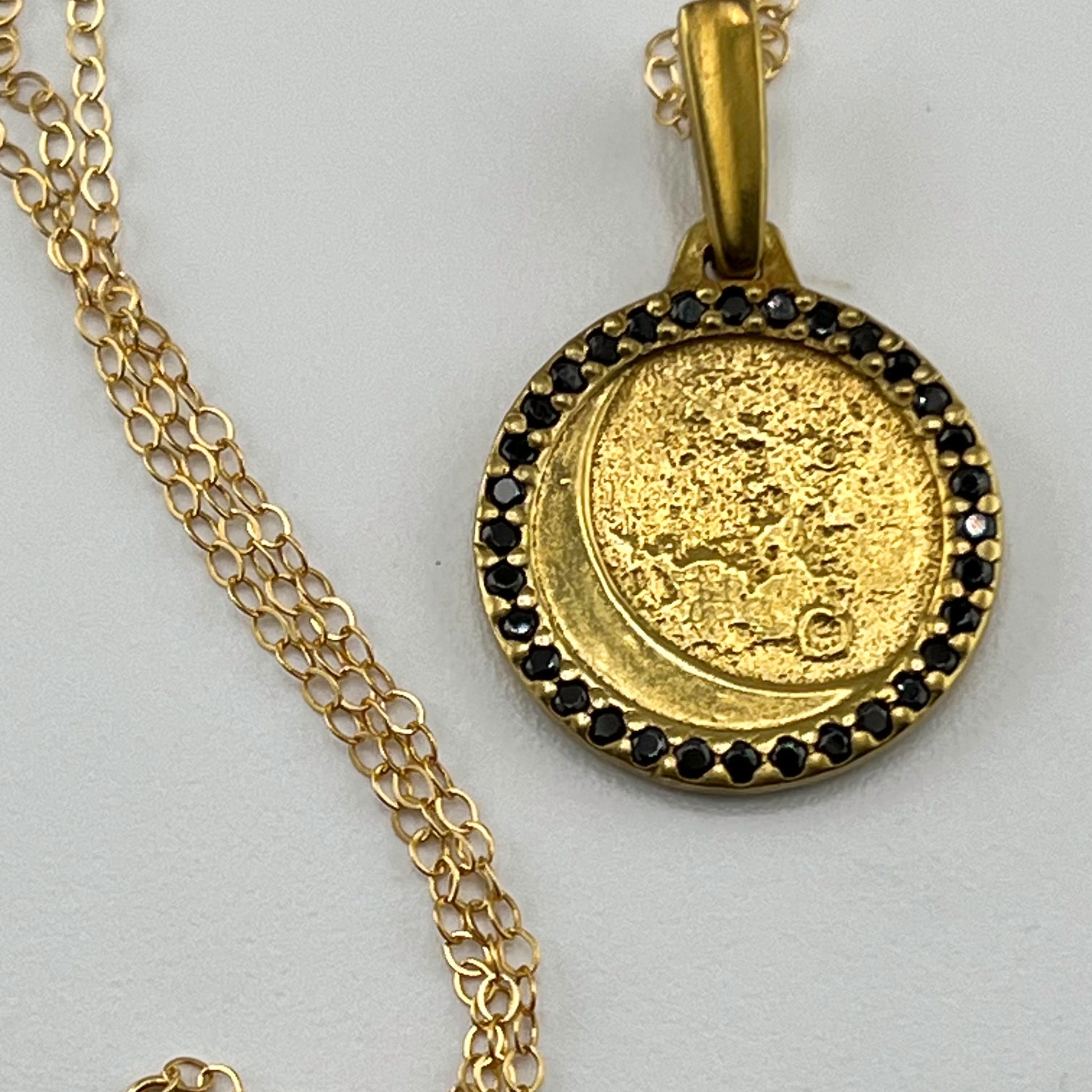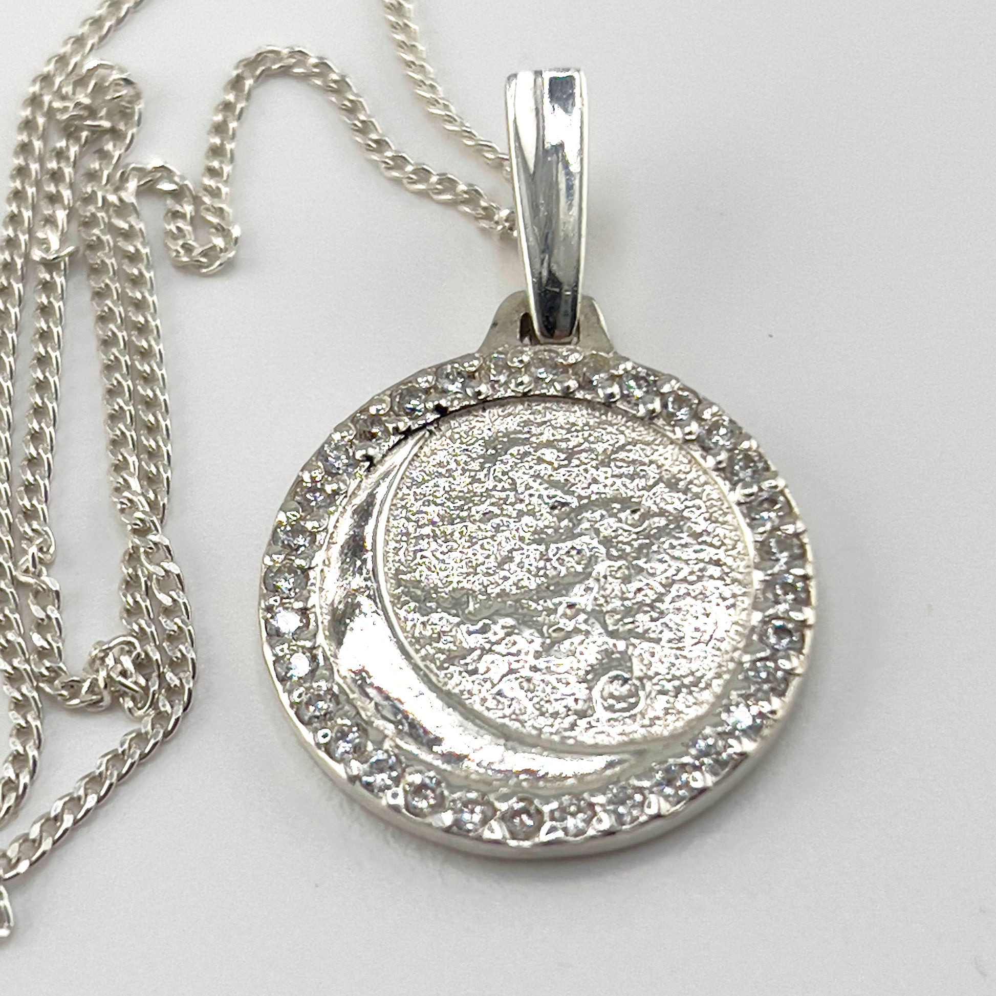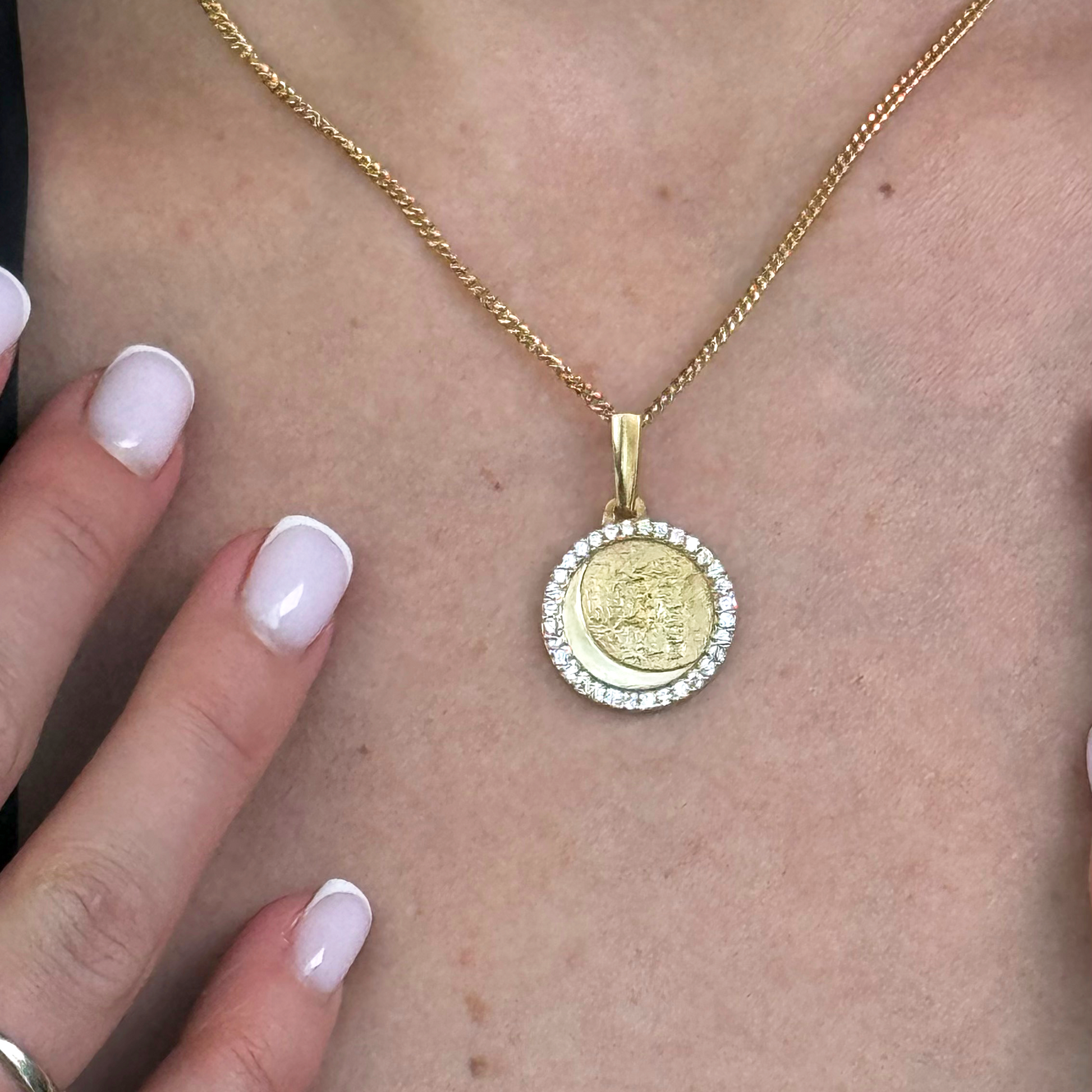 Its unique moon shape and realistic surface make it a stunning piece. The 32 gems encircling it add a touch of elegance, while its perfect size makes it an ideal accessory for any outfit. This necklace's original design makes it a must-have for any jewelry collection.