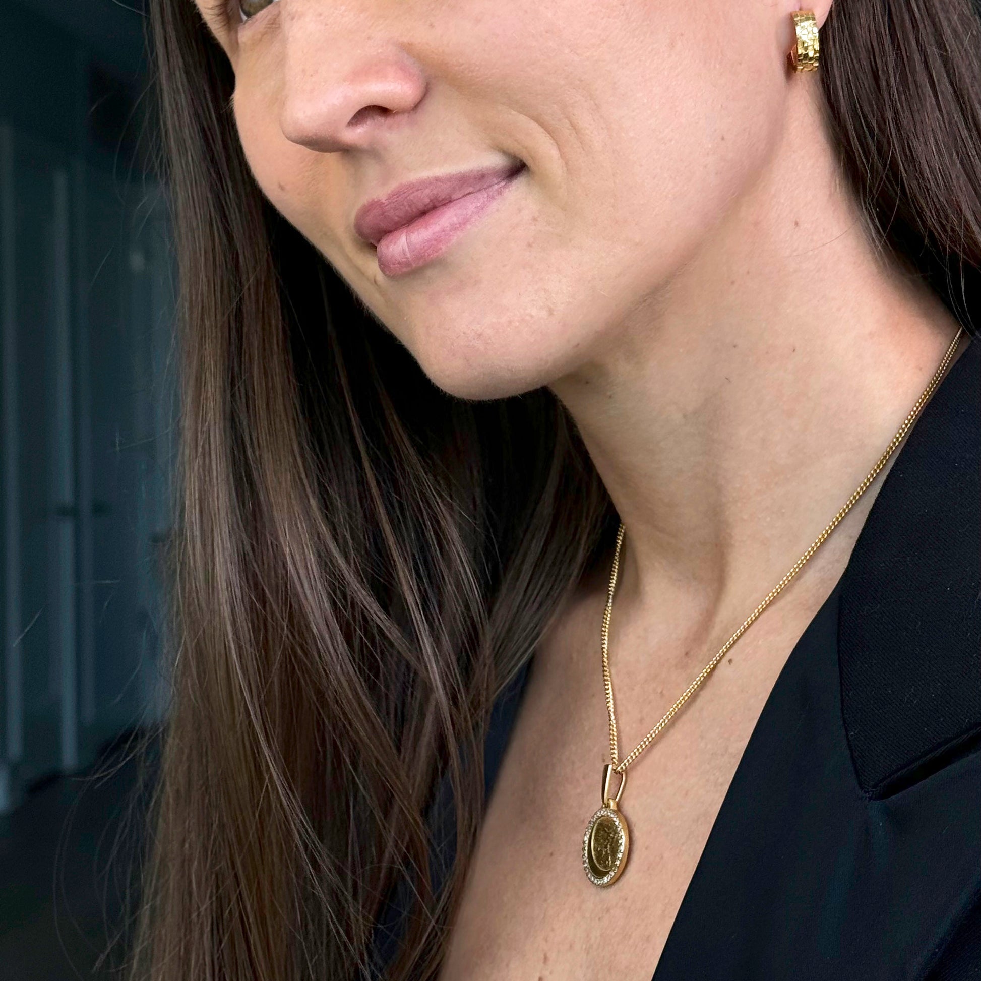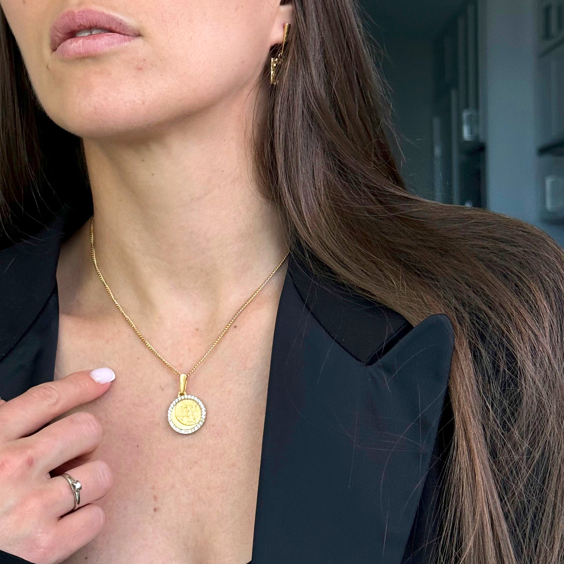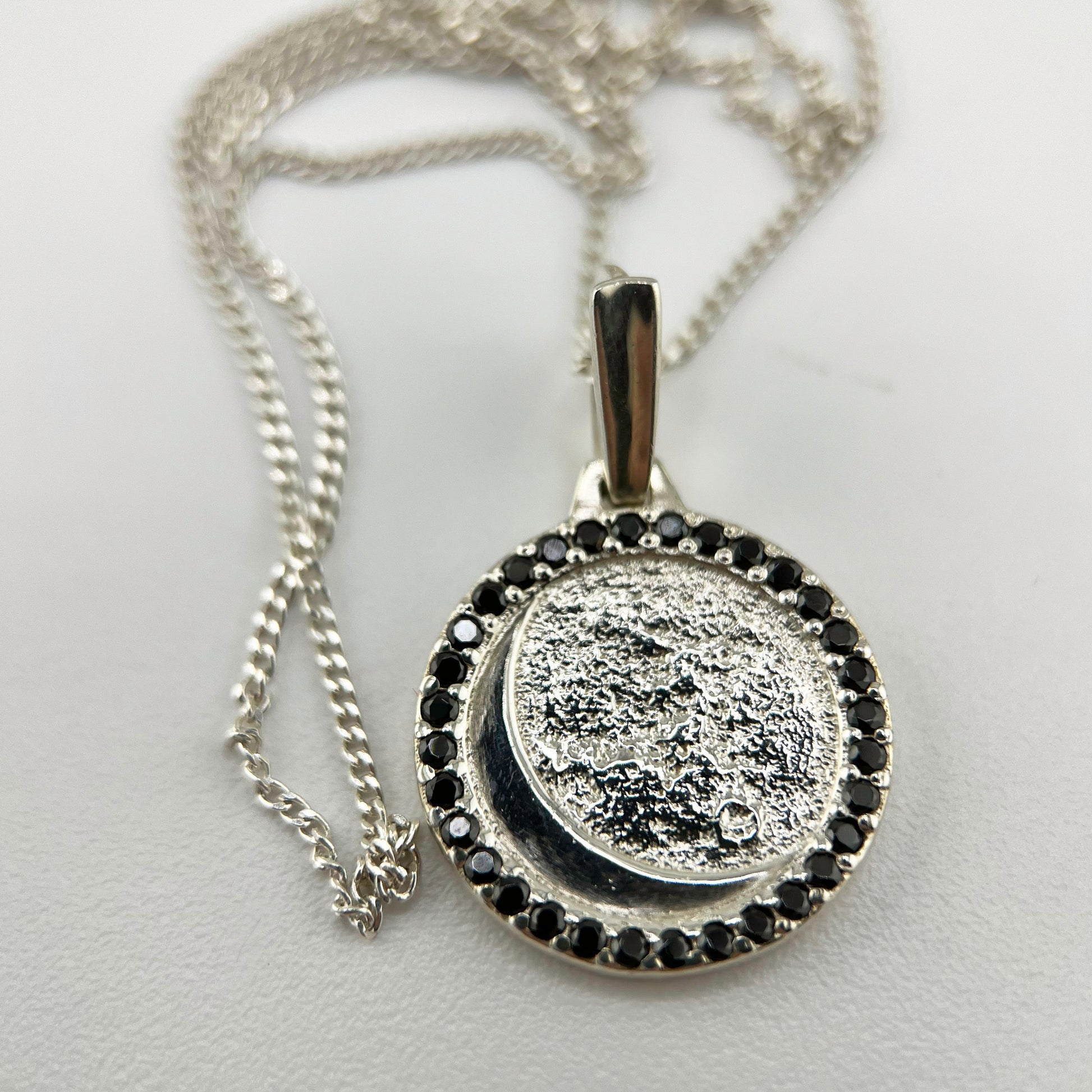 Its unique moon shape and realistic surface make it a stunning piece. The 32 gems encircling it add a touch of elegance, while its perfect size makes it an ideal accessory for any outfit. This necklace's original design makes it a must-have for any jewelry collection.